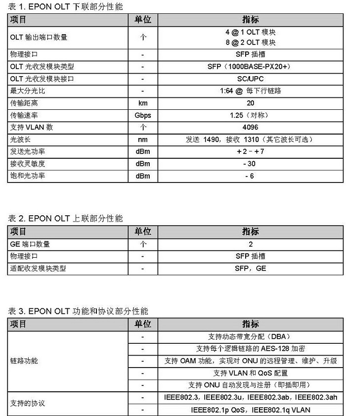 GSDCOH 提供 2 個(gè)上聯(lián) GE 端口,4 或 8 個(gè)下聯(lián)千兆 OLT 端口,1 個(gè) MGMT 本地管 理端口, 1 個(gè) console 故障診斷端口, 1 個(gè) RS-232 串口。該 頭端 OLT 的最大分光比為 1:64, 系統(tǒng)最大可支持 256(1 個(gè) OLT 模塊)或 512(2 個(gè) OLT 模塊)個(gè) ONU。